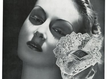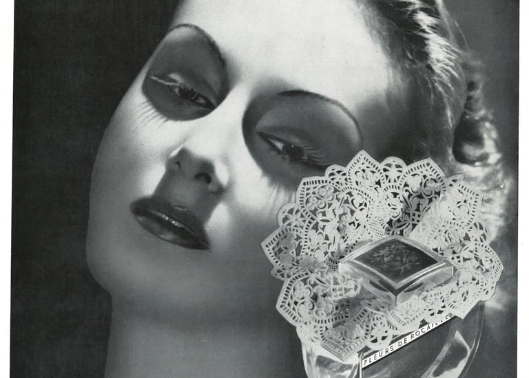 Luxury French brand vintage ads in dramatic black and white, featuring a blend of photography and illustration.